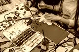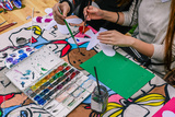 Girls paint colors at the table. In the hands of the brush. Color palette with paints