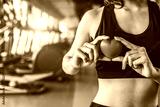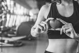Happy sport woman holding red heart in fitness gym club. Medical cardio heart strength training lifestyle. Pretty female sport girl workout exercise. Cardiac healthy and well-being. Massage ball in ha