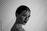 Black and white portrait of a beautiful young girl with a shadow pattern on the face and body in the form of stripes.
