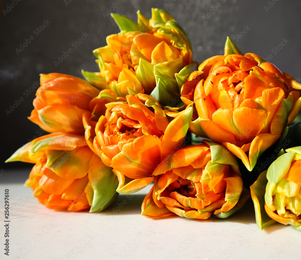 Beautiful orange tulips on white backdrop. Perfect for background greeting card