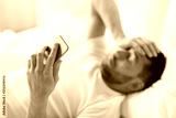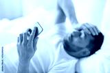 technology and people concept - hand of young man with smartphone in bed at home in morning