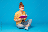 education, high school, inspiration and people concept - smiling red haired teenage girl in checkered shirt and torn jeans with diary or notebook and pencil over grey background