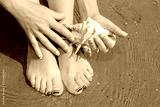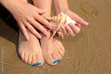 Marine French manicure and pedicure with blue and orange stripes on short nails on the coast in Sunny weather.Nail design.Nail art.