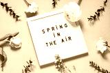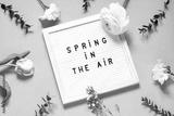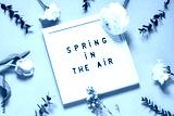 Spring in the air text on the felt border. Seasonal concept card with flowers. Top view