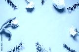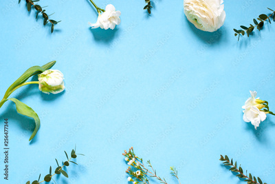 Floral spring frame with flowers on the blue background. Top view. Copy space