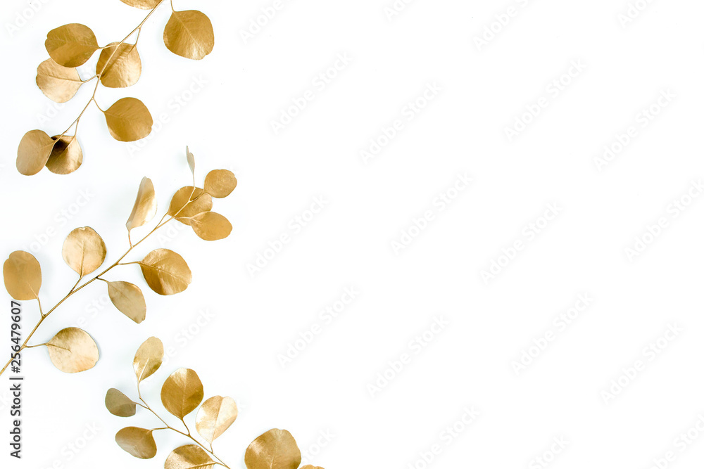 Borders of the frame of gold branches, eucalyptus leaves on a white background. flat layout, top view