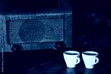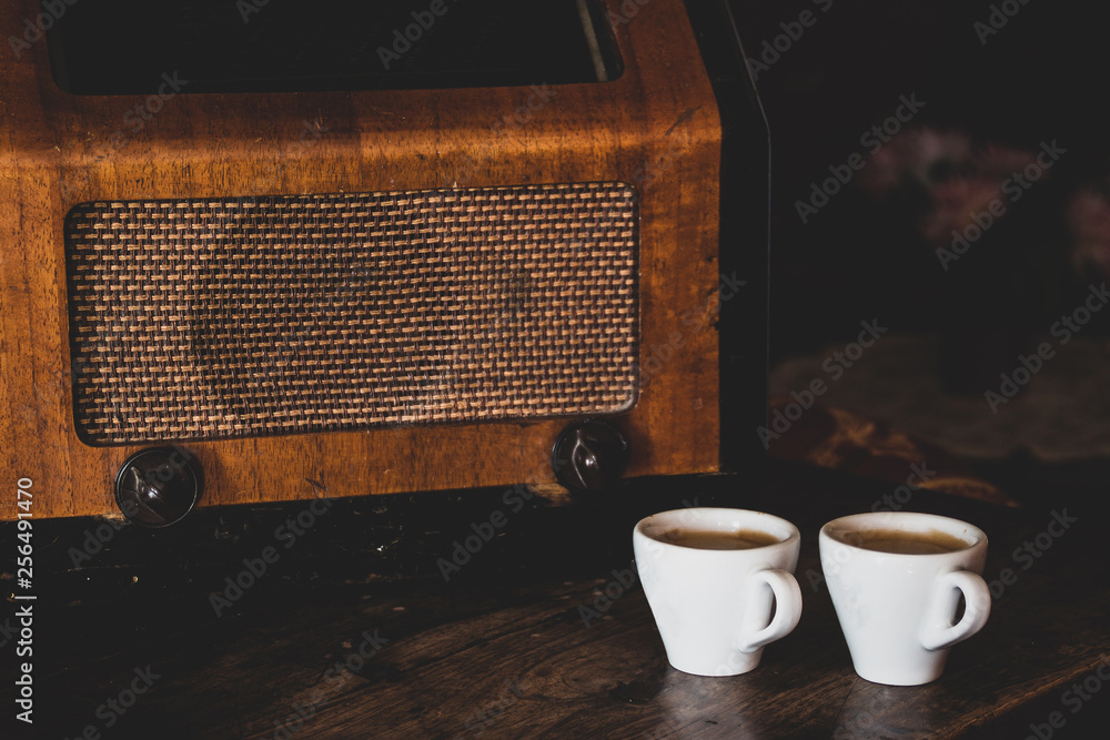Two coffee cups with espresso and retro radio on dark wooden background. Vintage color tone