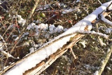 A snow covered branch and red bittersweet berries at White Memorial Conservation scenic area on a sunny winter day in Litchfield Connecticut.