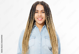 African american girl in fashion clothes isolated on white background. Woman hipster with afro hair style. Copy space
