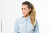 African american girl in fashion clothes isolated on white background. Woman hipster with afro hair style. Copy space