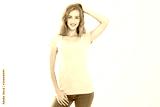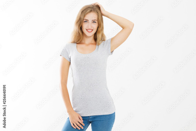Young blonde woman with fit slim body in blank template t shirt and jeans isolated on white background. Skin and hair care. Copy space and mock up