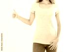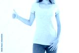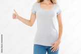 T shirt template. Girl showing big thumb up gesture sign isolated on white background. Body language. Copy space and mock up. Cropped image