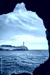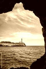 Portocolom Lighthouse seen from a cave, Mallorca, Spain.