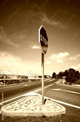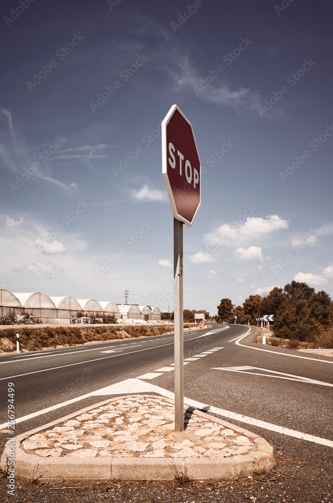 Stop sign at road crossing, color toned picture.