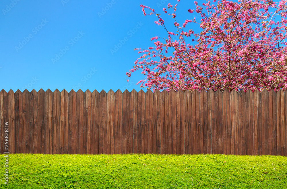 a wooden garden fence at backyard and bloom tree in spring