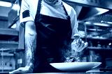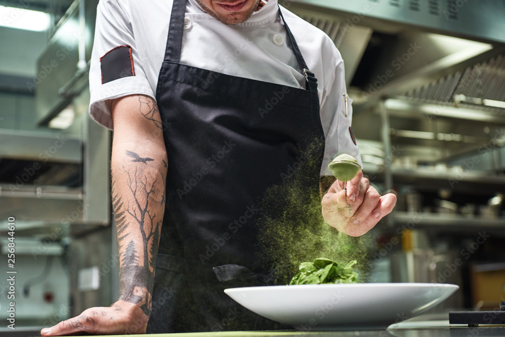 Slow motion. Cropped image of chef's hands with tattoos adding spices in salad while standing in a restaurant kitchen.
