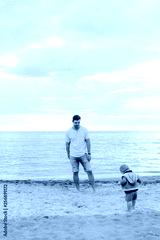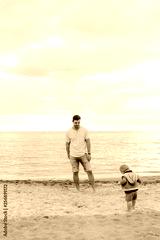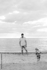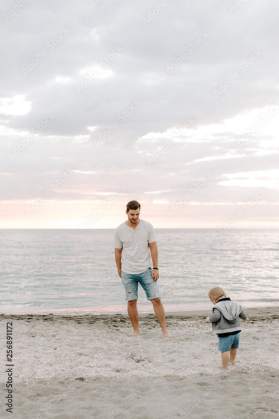 Adorably Perfect Young Father and Baby Toddler Son Family Having Fun Time at the Sandy Beach During Sunset Outside By the Ocean Water on Vacation