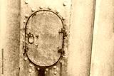 metal old plate weathered gray rivets door oval part of the boat hull close-up industrial background design base