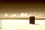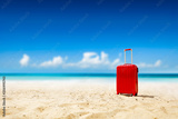 Summer red suitcase on beach and sea landscape. Free space for your decoration. Summer time