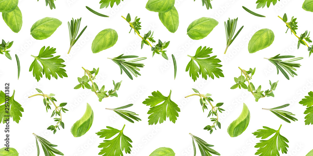 Different spices and herbs seamless pattern isolated on white background, top view
