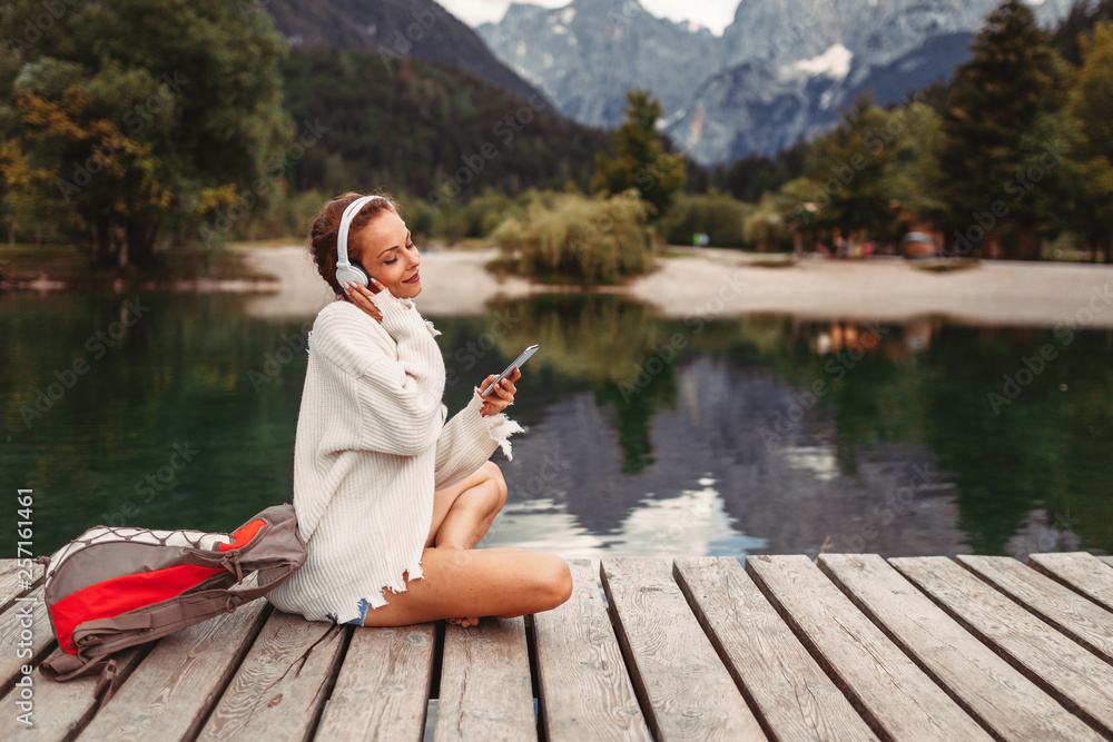 Attractive young woman listening to music via wifi headphones and smartphone on the lake