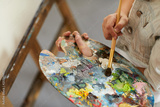 Closeup of unrecognizable girl holding artists palette and mixing colors while painting on easel in art class, copy space