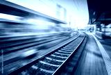 Railway station with motion blur effect at sunset. Industrial landscape with railroad, blurred railway platform, sky with orange sunlight in the evening. Railway junction in Europe. Transportation