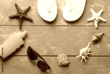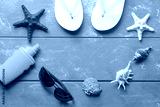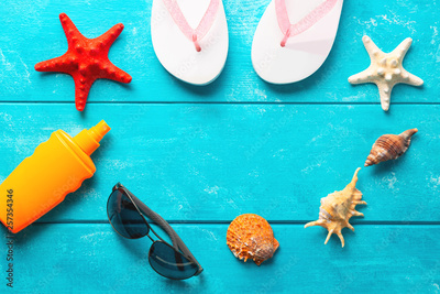 Beach accessories. Summer holidays and vacation travel concept. Sunscreen lotion bottle, flip flops, shell ,sunglasses and red starfish on pastel blue background. Top view and copy space