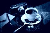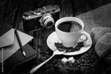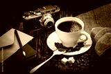 still life grain coffee sugar retro camera croissant sugar pencil and notebook wooden