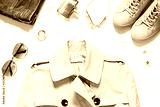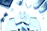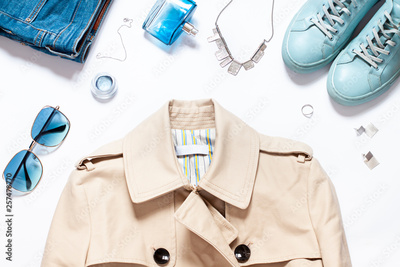 Fashion concept flat lay with trench coat. Casual outfit top view.