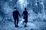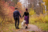 couple, people, golden, fall, retriever, forest, together, walking, nature, woman, caucasian, healthy, man, male, lifestyle, season, love, outdoors, park, romantic, autumn, romance, lovely, fit, walk