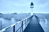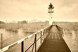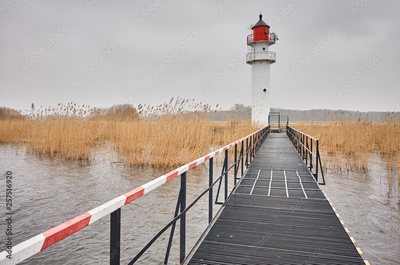 Inland waterway lighthouse seen from a steel pier