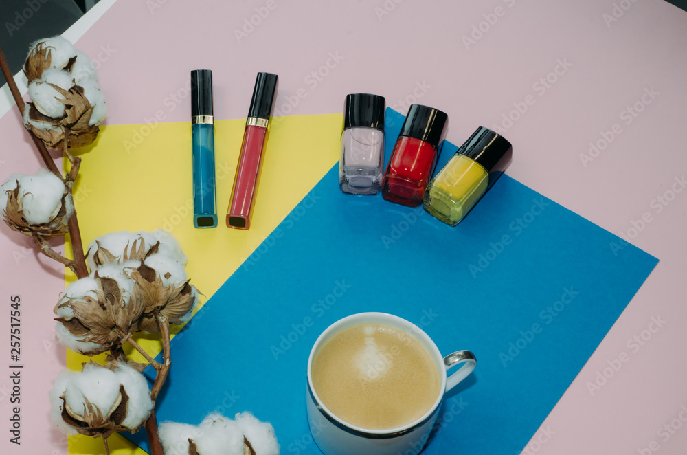 Top view of red, pink and blue lipsticks. Cotton flower.