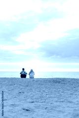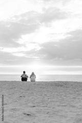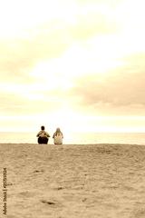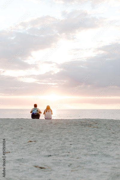 Two People Watching the Beautiful and Serene Sun Set Over the Ocean Horizon While Sitting in the Sand at the Tropical Beach