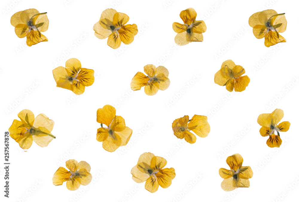 flat pressed dried flower pattern isolated on white background
