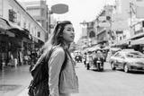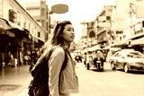 Young happy Asian female tourist backpacker walking and looking away on Khao San road in summer during trip to Bangkok, Thailand
