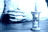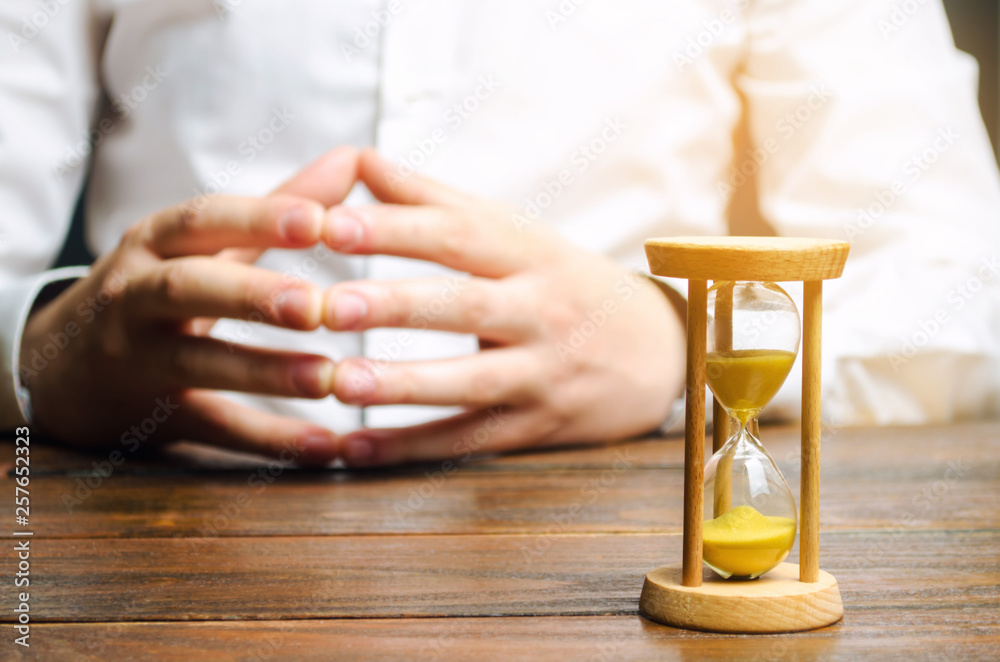 An hourglass and businessman holds his hands in the lock. Job interview concept. Business planning. Management and distribution of time. Making a business deal. Debt restructuring.