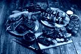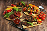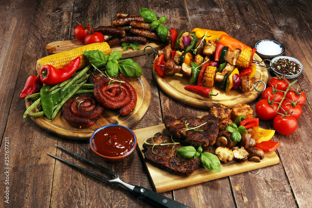 Assorted delicious grilled meat and skewer with vegetable on rustic table