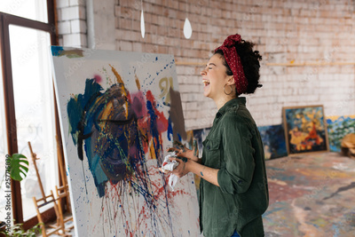 Young pretty cheerful woman with dark curly hair happily laughing drawing picture on canvas by hands with bright oil paints while spending time in big cozy workshop