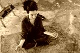 Young beautiful woman with closing eyes sitting on yoga mat in lotus pose and meditating dreamily spending time in big workshop with paint splashes around