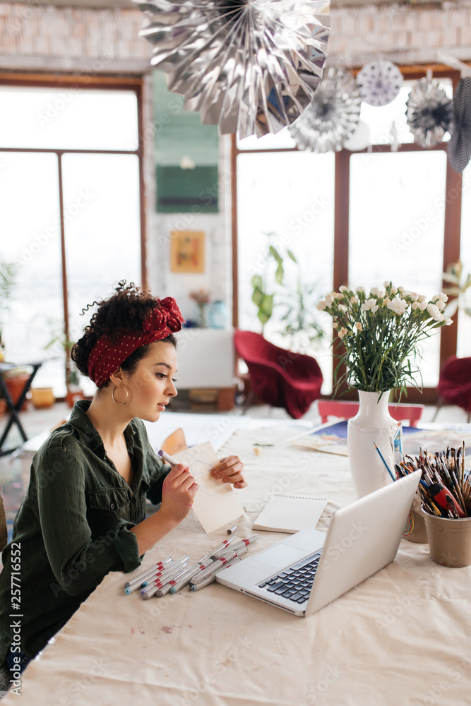 Young gorgeous woman with dark curly hair sitting at the table thoughtfully showing sketch in laptop while spending time in modern cozy workshop with big windows