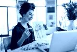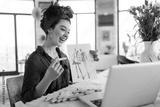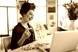Young cheerful woman with dark curly hair sitting at the table happily showing fashion sketch in laptop while spending time in modern cozy workshop with big windows