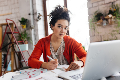 Young attractive woman with dark curly hair sitting at the table with laptop and drawing fashion illustrations dreamily looking in camera in modern workshop with big windows