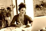 Young smilng woman with dark curly hair sitting at the table happily working on laptop drawing fashion illustrations while spending time in modern cozy workshop with big windows