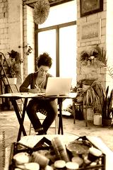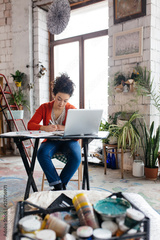 Young beautiful woman with dark curly hair sitting at the table with laptop dreamily drawing illustrations while spending time in amazing workshop with big window