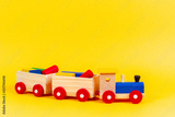 Wooden toy train with colorful blocks on yellow background