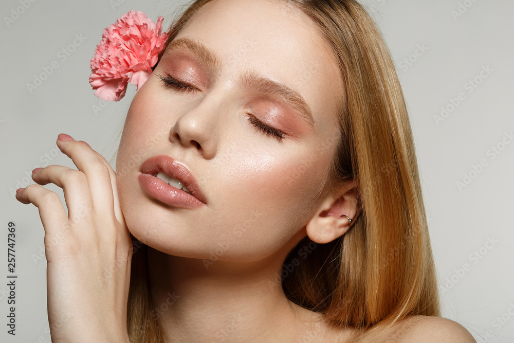 Beautiful young woman with eyes closed, perfect skin