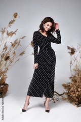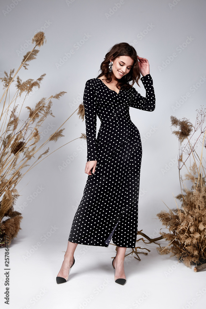 Pretty fashion beauty model curly dark hair style beautiful sexy woman perfect skinny body shape cosmetic makeup face wear clothes long silk dress accessory jewelry shoes studio background herb reed.