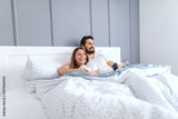 Young smiling happy attractive Caucasian couple lying in bed and watching television in the morning. Bedroom interior.