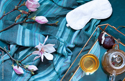 Breakfast in bed flat lay with magnolia flowers and green tea with marshmallows. Tea break concept. Top view spring composition